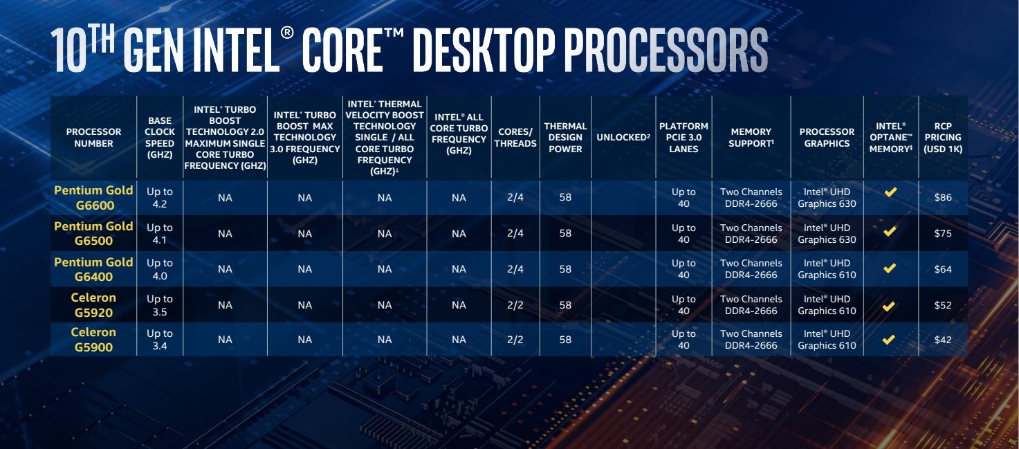 Ở phân khúc giá rẻ thì dòng Pentium và Celeron cũng được làm mới với xung nhịp cao hơn, số nhân thì vẫn vậy và TDP là 58 W, tăng 4 W so với thế hệ trước trên các phiên bản tiêu chuẩn và dòng T tiết kiệm điện là 35 W.