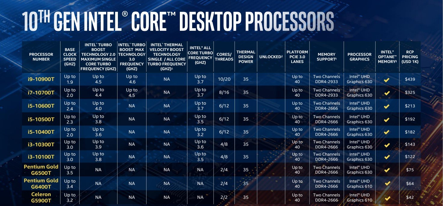 Và như vậy là Intel cũng đã kịp ra mắt những vi xử lý thế hệ 10 (Comet Lake-S) dành cho desktop. Không khác so với những thông tin rò rỉ trước đó, Intel đã mở siêu phân luồng cho tất cả các phiên bản Core i từ i3 đến i9 cùng với giá bán khá hấp dẫn để có thể cạnh tranh tốt hơn với đối thủ AMD.