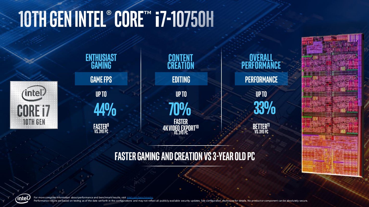 Hiệu năng của dòng Comet Lake-H cũng được Intel thể hiện khi so sánh với thế hệ Kaby Lake-H (đời 7). Core i9-10980HK với 8 nhân 16 luồng hiển nhiên đạt hiệu năng cao hơn nhiều so với Core i7-7820HK