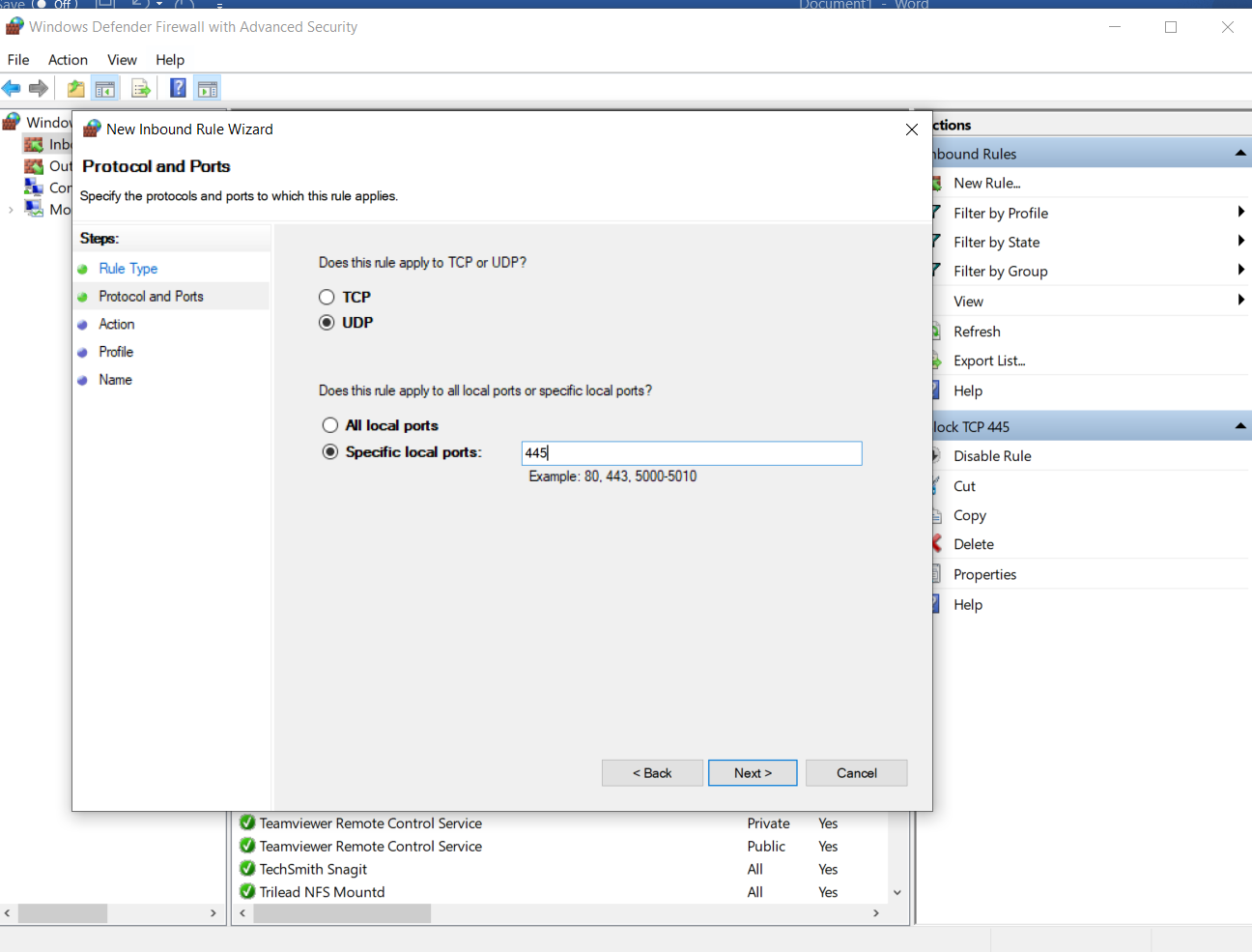 - Block Port UDP 445: